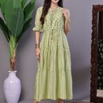Embrace bohemian chic with this beautifully styled tiered maxi dress. Featuring a flattering drawstring waist that defines your figure and soft, gently ruffled tiers for movement and grace. The mandarin-style neckline with a V-split adds a sophisticated touch, complemented by delicate embellishment accents on the yoke. Its elbow-length sleeves, finished with subtle gathering, make it perfect for both day and evening wear.